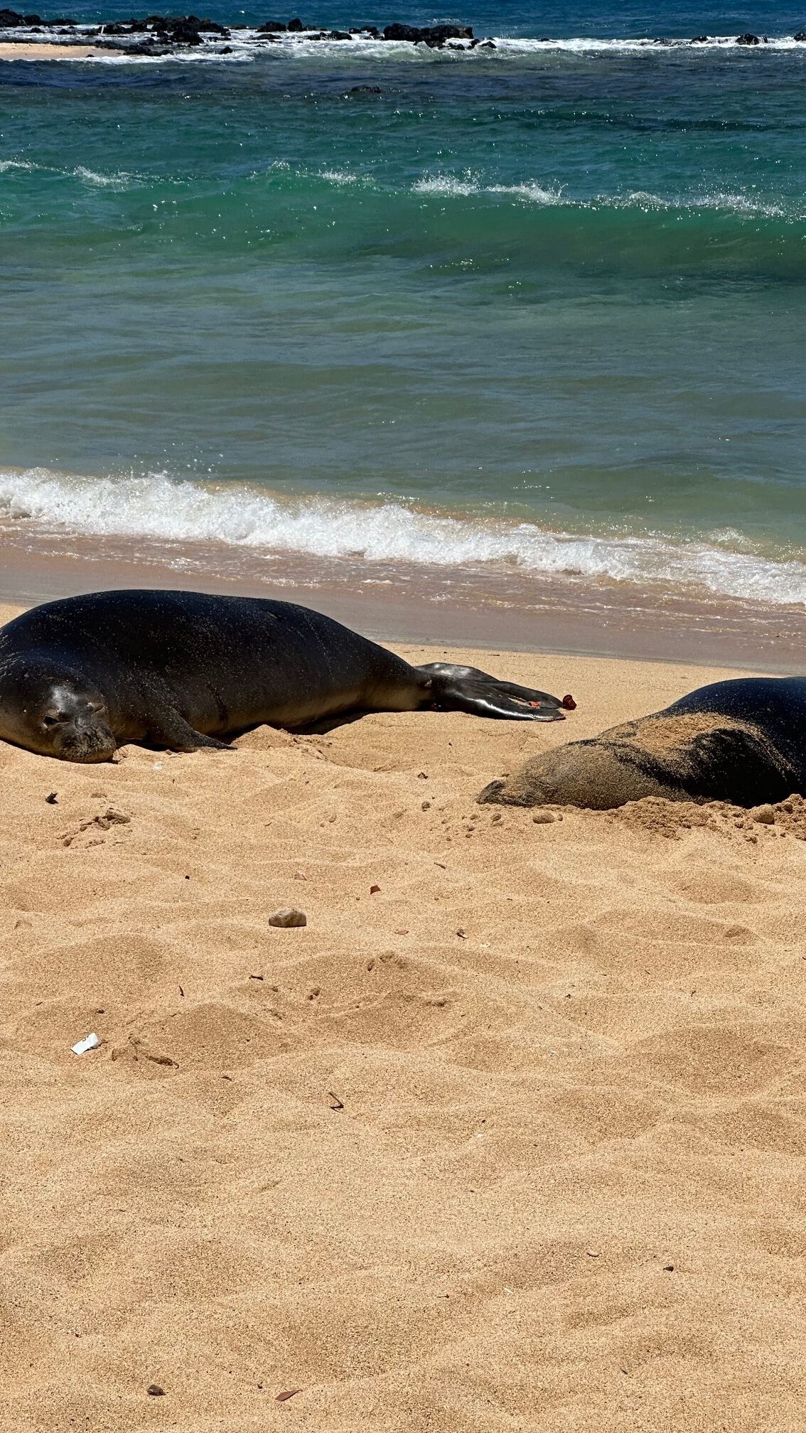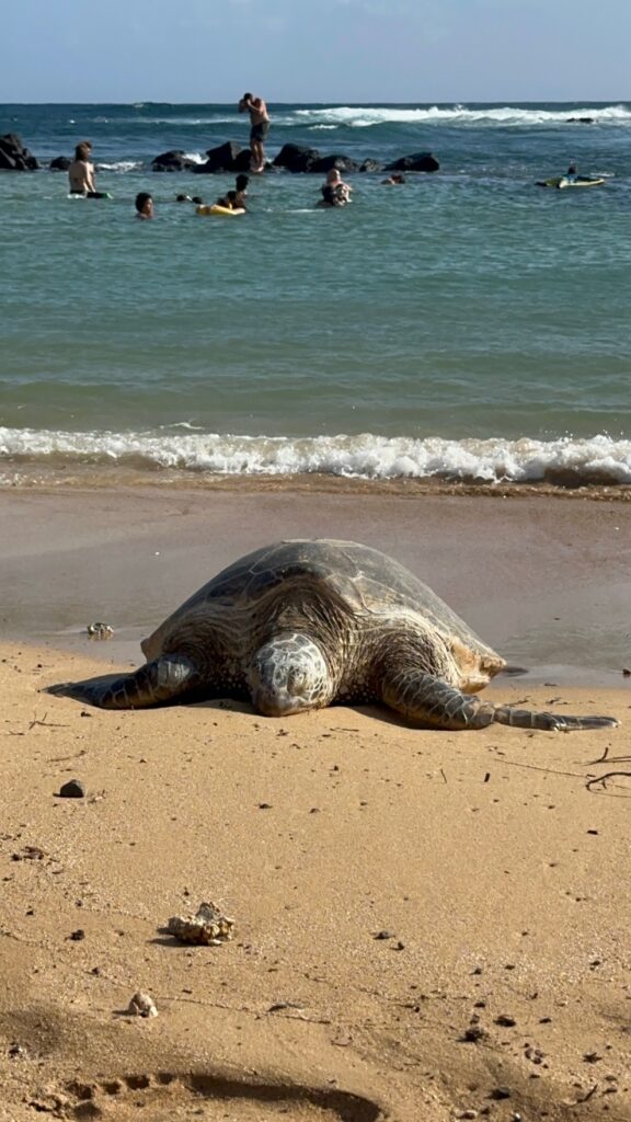 We were hoping for more snorkeling opportunities, but it turned out to have much bigger marine life to see right there on the beach. On our first day enjoying Poipu Beach, two Hawaiian Monk Seals came up onto the sand just one family over! They are endangered so shortly after they arrived, the area was roped off to allow them safety. The next day, a giant sea turtle came ashore!