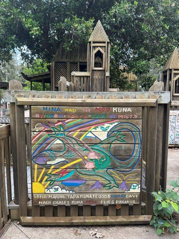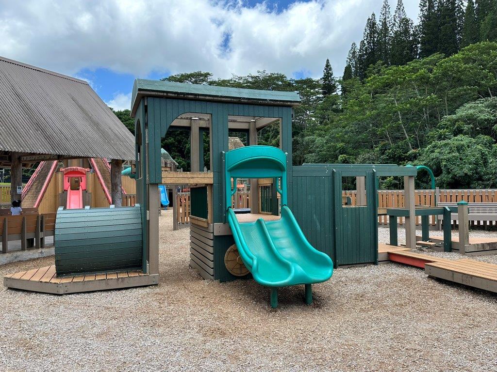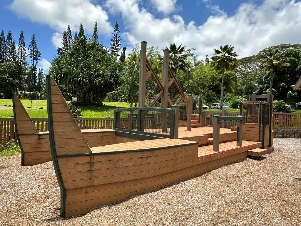 We saved our favorite playground for last! The Anaina Hou Community Park is so much more than a playground. The play structures represent Hawaiian history with its volcano slide, large boat, and local children’s artwork.