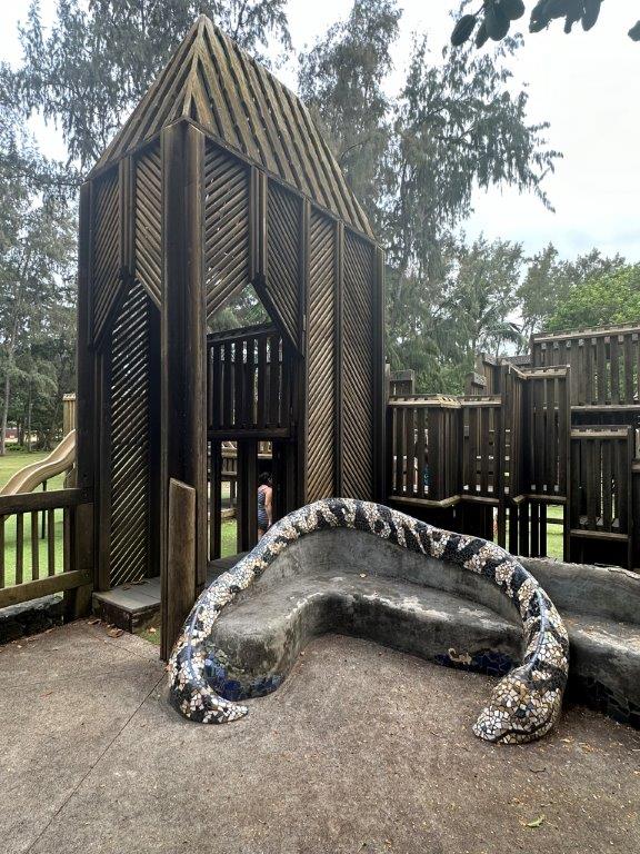 You actually will get two playgrounds at this spot! Lydgate State Park is a Regional Park with a large sized wooden playground (very similar to the Frisco Elementary playground here in Colorado) as well as a more modern playground, picnic shelters, pavilions, lifeguarded beach, and camping grounds.